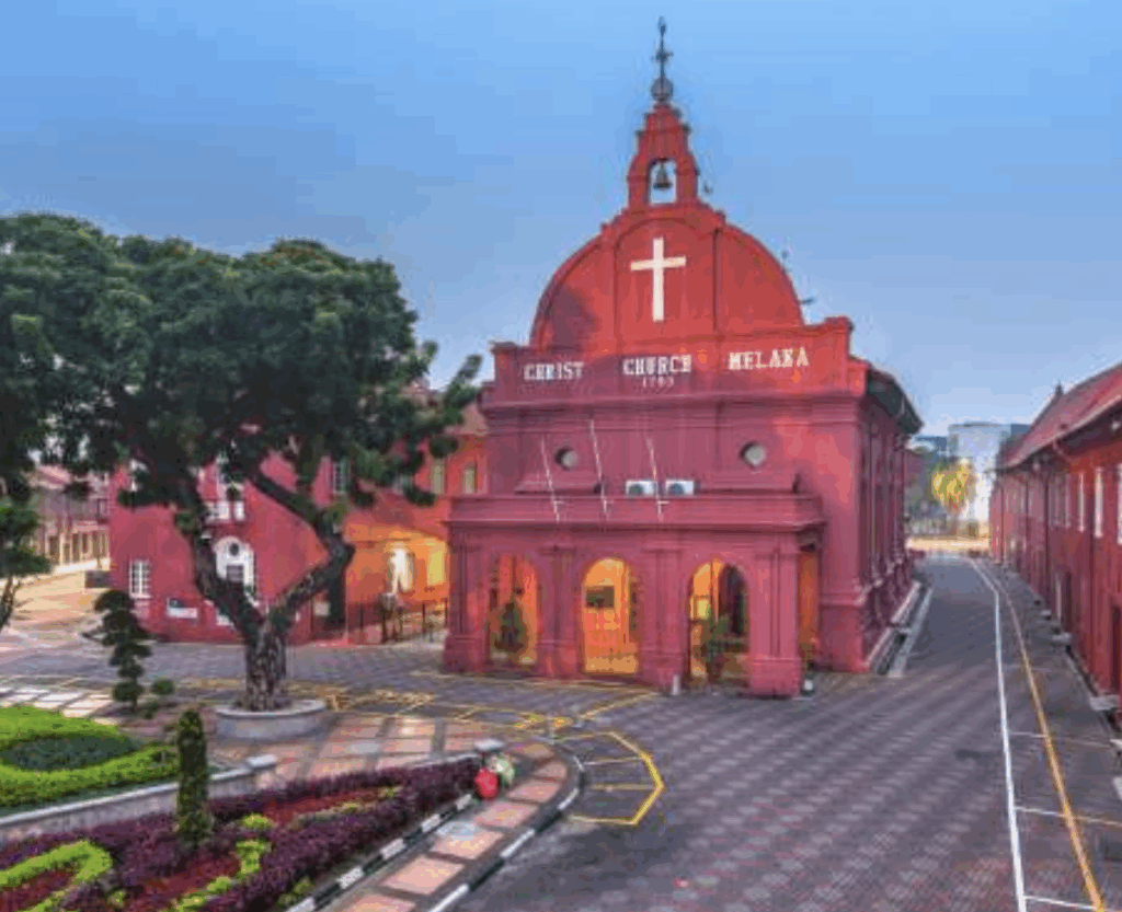 Visite de l’église Saint-Pierre, plus ancienne église catholique de Malaisie (1710), passage devant l’immense cimetière chinois du XVIIe siècle. Découverte de la Porte de Santiago, vestige de la forteresse portugaise A’Famosa, les ruines de l’église Saint-Paul perchée sur la colline Bukit St Paul, et la célèbre « Place Rouge » (Dutch Square) avec la Christ Church rouge vif et le Stadthuys, plus ancien bâtiment hollandais d’Asie du Sud-Est.